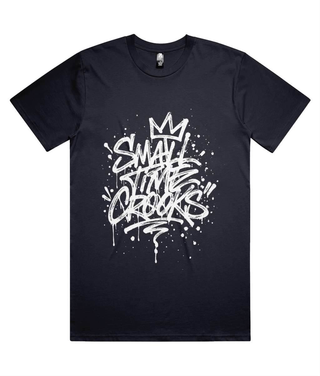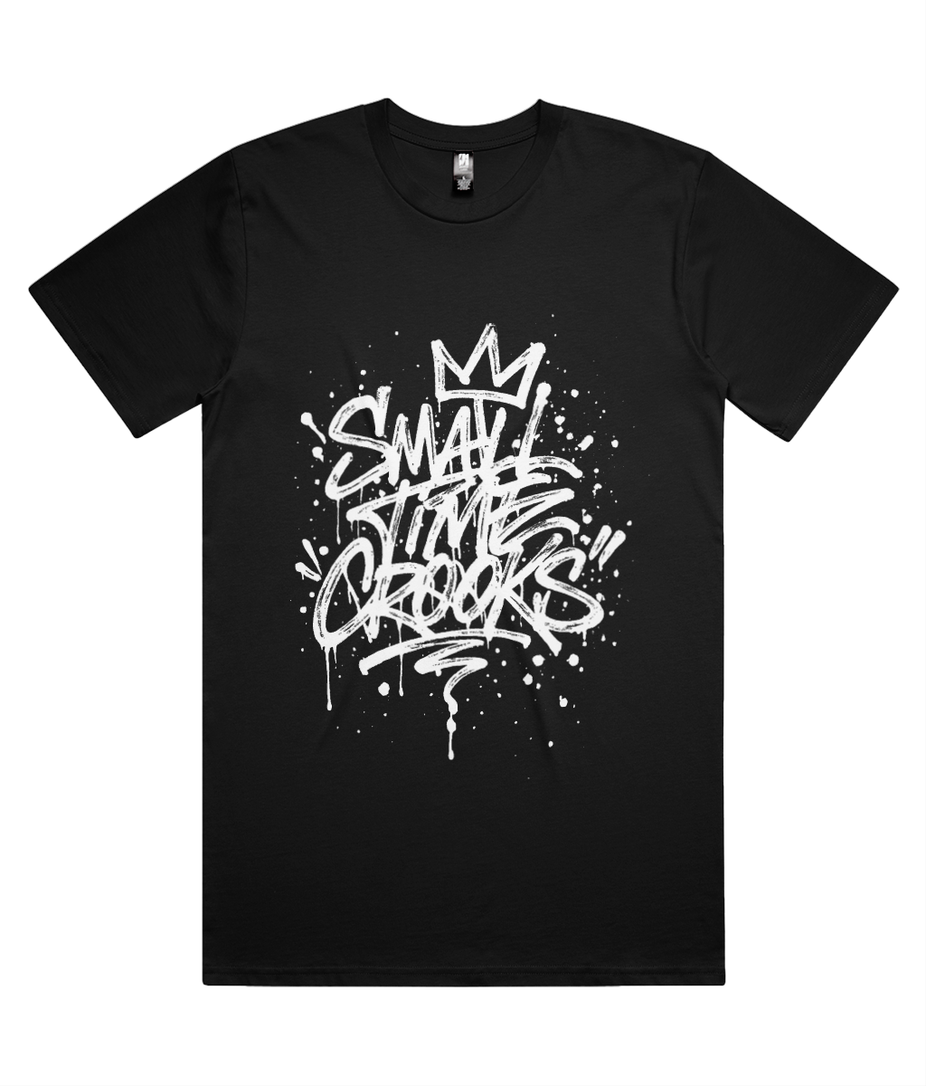 No gimmicks, no props, just a handstyle on a tee lookin' sick. A black graffiti tag reading “Small Time Crooks”, topped with the crown and surrounded by marker flicks and flares. Straight out the sketchbook, bold across the chest, no spray cans needed.